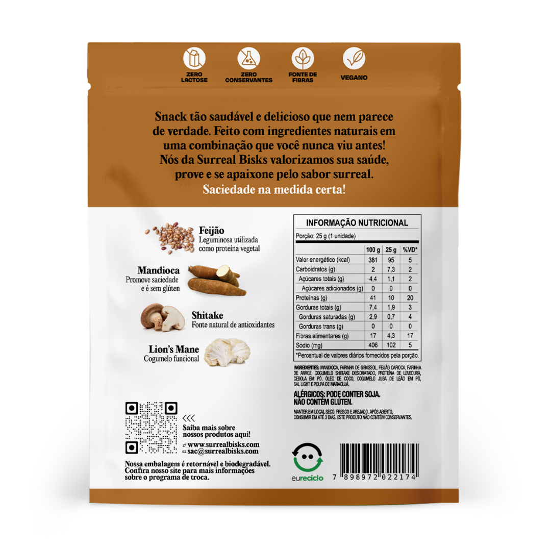 Tudo isso sobre a nossa base de mandioca e feijão, garantindo crocância, proteína e fibra na medida certa.